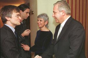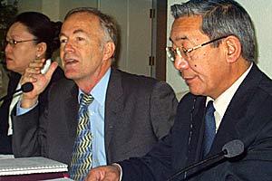 Minister of Justice Kurmanbek Osmonov (right), Head of the OSCE Centre in Bishkek Markus Mueller (centre), and Baekova Cholpon, Chairwoman of the Kyrgyz Constitutional Court, at a conference on reforming the criminal justice system, 24 January 2004.