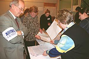 An OSCE observer watches officials count ballots after the polling station closed in Moscow, 7 December 2003. Russia held elections for the State Duma, the lower house of parliament.