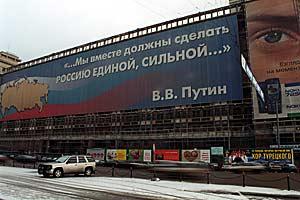A poster quotes Russian President Vladimir Putin: "Together we must make Russia united and strong..." in downtown Moscow, 6 December 2003, a day before the State Duma elections.