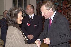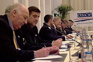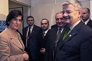 Then acting Georgian President Nino Burjanadze listens to Ambassador Roy Reeve, Head of the OSCE Mission to Georgia, at the Maastricht Ministerial Council, 1 December 2003.