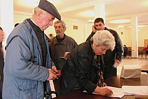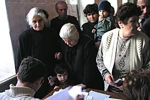 Inside the polling station, local residents complete the steps necessary to vote, Bolnisi, Georgia, 2 November 2003.
