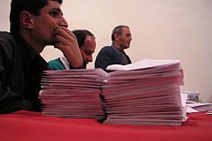 At 11:43 PM, Election station officials organize ballots into piles, Bolnisi, Georgia, 2 November 2003.