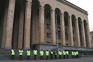 Police stand outside the parliamentary building on Rustaveli Avenue, Tbilisi, Georgia, 8 November 2003.