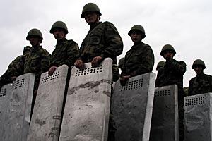 Riot police stand ready in Republic Square, Tbilisi, Georgia, 5 November 2003.