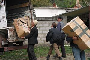 Aid is delivered to returnees in Biti e Eperme/Gornja Bitinja, Kosovo, November 2003.