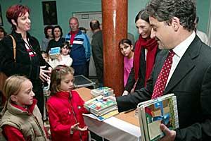 Head of the OSCE Mission to Serbia and Montenegro, Maurizio Massari, hands out notebooks to children as part of a larger initiative to raise awareness about the Mission's activities, October 2003.
