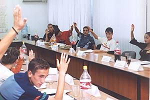 During the first session of the Kosovo Youth Assembly, discussions focused on approving the agenda, the group's statute and the rules of procedure, October 2003