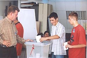 During the voting process for the president of the first Kosovo Youth Assembly, OSCE staff ensured that the electoral process was fair, democratic and transparent, October 2003.