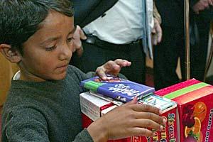 Children in Gamzigradska banja refugee camp, southern Serbia, receive presents through an awareness-raising initiative of the OSCE Mission to Serbia and Montenegro, October 2003.