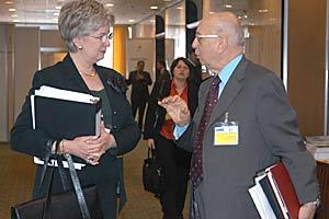 Ambassador Anton Rupnik (right), Head of the OSCE Centre in Almaty, meeting with Ambassador Pamela Hyde Smith, Head of the U.S. delegation, at the OSCE's Human Dimension Implementation Meeting, which was held in Warsaw 6-17 October 2003.