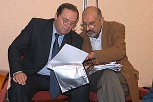 Ambassador Anton Pinter (left), Head of the Permanent Mission of Slovakia to the OSCE, meeting with Nicolae Gheorghe, Head of the ODIHR's Contact Point for Roma and Sinti Issues, at the Human Dimension Implementation Meeting, Warsaw, 15 October 2003.