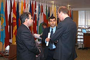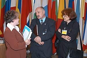Two members of the ODIHR's NGO Unit (centre, right) meeting with a participant at the Human Dimension Implementation Meeting, Warsaw, 15 October 2003. The ODIHR organized the participation of over 200 NGOs, the most ever, at this year's meeting.