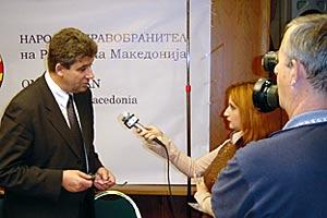 Ombudsperson Branko Naumoski talks to press, after the launch of a public information campaign with the OSCE Mission, "The Ombudsman is on your side", Skopje, 24 October 2003.