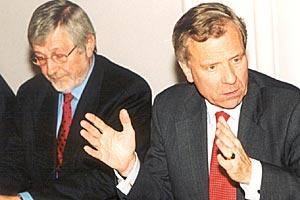The OSCE Chairman-in-Office Jaap de Hoop Scheffer (right) on a visit to Georgia, with Ambassador Roy Reeve, Head of the OSCE Mission to Georgia, 23 October 2003.