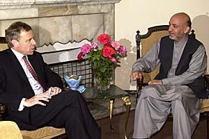 OSCE Chairman-in Office, Dutch Foreign Minister Jaap de Hoop Scheffer, met Afghan President Hamid Karzai during a bilateral visit to Kabul in July 2003.