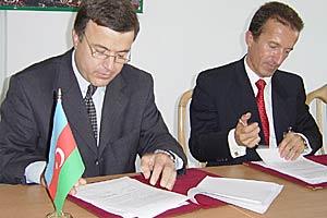 Peter Burkhard, Head of the OSCE Office in Baku (right), and Hussein Bagirov, Azerbaijan's Minister of Ecology and Natural Resources, officially opened an environmental information centre in Baku, 23 September 2003.