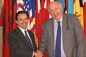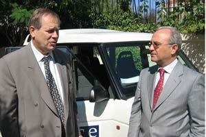 Head of the OSCE Presence in Albania, Ambassador Osmo Lipponen (left), and Head of the Bulgarian Delegation to the OSCE, current chairman of the OSCE Permanent Council, Ambassador Ivo Petrov, during Ambassador Petrov's visit to Albania, 17 September 2003.