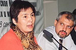 Gulnara Ibraeva (left), from the American University in Central Asia, with Alex Ivanko, of the Office of the Representative on Freedom of the Media, speaking at the fifth OSCE Central Asia Media Conference in Bishkek, 18 September 2003.