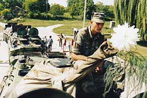 Blessings and flowers accompany Moldovan military forces as they roll out from the Cocieri military base, 14 August 2003.