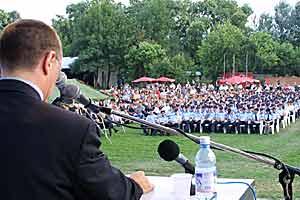 Ambassador Craig Jenness, Head of the OSCE Spillover Monitor Mission to Skopje, addresses the 350 police cadets who finished a three-month training course on 30 July 2003.