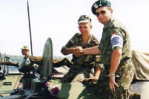 Col. Jan Nadolski, military mission member of the OSCE Mission to Moldova, congratulates a young Moldovan conscript on the withdrawal from the security zone as they prepare to cross the river Dniestr, 14 August 2003.