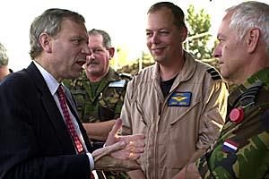 A final stop on his trip to Kyrgyzstan is a visit to the Dutch troops stationed at Manas airbase, as part of the Netherland's military engagement in neighbouring Afghanistan, 9 July 2003.