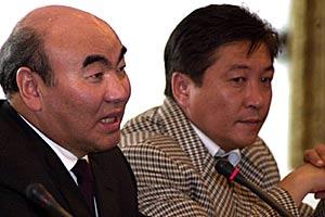 The Kyrgyz President, Askar Akaev (left), and Deputy Foreign Minister Talant Kushchubekov, 9 July 2003.