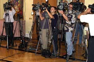 Local and international media waiting for the OSCE Chairman-in-Office to appear after his meeting with Kazakhstan's President Nursultan Nazarbayev, 7 July 2003.