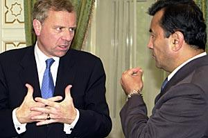 Before meeting the Uzbek President, Minister de Hoop Scheffer continues his discussion with Foreign Minister Safayev, 8 July 2003.