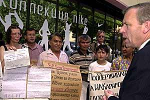 Minister de Hoop Scheffer speaks to demonstrators in front of the OSCE Centre in Tashkent, to find out their demands, 8 July 2003.