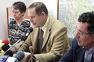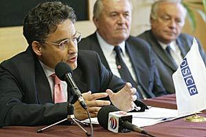 Head of the OSCE Presence in Albania, Ambassador Osmo Lipponen (centre), presents Technical Experts Group for Property to the media at the Presence's HQ, 25 June 2003.