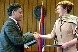 Head of the OSCE Mission to Serbia and Montenegro, Maurizio Massari, and Acting Serbian President and Serbian Parliament Speaker, Natasa Micic, Belgrade, 12 June 2003.