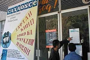 A Tajik-language sign invites people to see films on human rights during an OSCE-sponsored cinema tour in southern Tajikistan, May 2003.
