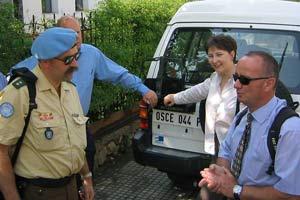 The OSCE staff at the field station in Kukes, Albania, discuss issues of joint concern with the UNMIK police, 15 May 2003.