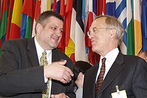 Jan Kubis, the OSCE Secretary General (left), and Daan Everts, Personal Representative of the CiO, at the opening of the 11th Economic Forum in Prague, 20 May 2003.