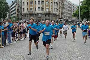 Festivities at the start of the seventh "Blossom Run", a relay marathon connecting Tetovo and Skopje, organized by the OSCE Mission to Skopjem, 18 May 2003.