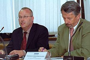 Deputy Head of Mission Rolf Van Uye (left) and Director of Democratization Unit Friedhelm Frischenschlager presenting a report on the harmful effects of boycotting municipal assemblies, 15 May 2003.