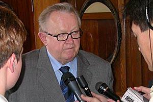 Personal Envoy of the OSCE CiO, Martti Ahtisaari, speaking to journalists in Kyrgyzstan during his second working visit to Central Asia, 21 May 2003.