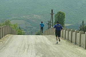 Ambassador Craig Jenness, Head of the OSCE's mission in Skopje, finishes the seventh "Blossom Run" marathon connecting Tetovo and Skopje, 18 May 2003.