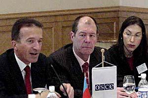 The Head of OSCE Office in Baku, Amb. Peter Burkhard (left), opens a meeting focusing on global combat against terrorism and respect for human rights, Baku, 30 April 2003.