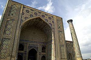 The madrasa (religious school) built by the famous Uzbek king and astronomer Ulugh Bek between 1417 and 1420 is the oldest monument on Samarkand's Registan square.