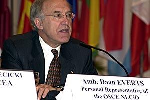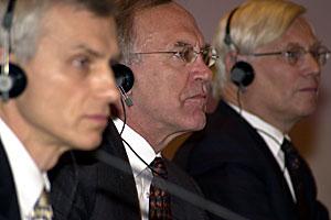 Marcin Swiecicki, Co-ordinator on OSCE Economic and Environmental Activities, Daan Everts, Personal Representative of the OSCE CiO, and Jan van Dijk, UNODC, at an OSCE seminar on drugs trafficking in Tashkent, Uzbekistan, 17 and 18 March 2003.