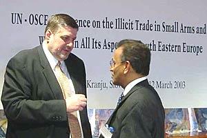 Jan Kubis, the OSCE Secretary General (left) and the UN Under Secretary General for Disarmament Affairs, Jayantha Dhanapala, met in Brdo, Slovenia, to discuss measures to combat small arms trafficking, 11 March 2003.