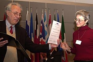 Russian journalist Anna Politkovskaya received the 2003 OSCE Prize for Journalism and Democracy from Freimut Duve at the Parliamentary Assembly's Winter Meeting in Vienna, 20 February 2003.