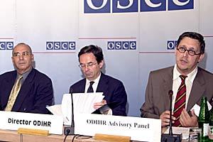 UN Special Rapporteur on Freedom of Religion or Belief, Abdelfatah Amor (left), ODIHR Director Christian Strohal and Ruediger Noll, ODIHR Advisory Panel on Freedom of Religion or Belief, at a press conference in Vienna, 17 July 2003.