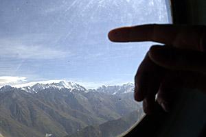 A Georgian border guard watches through the window as his helicopter approaches Shatili station.
