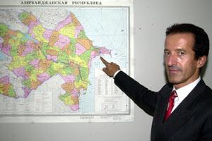 The Head of the OSCE Office in Baku, Ambassador Peter Burkhard, in front of a map of Azerbaijan.