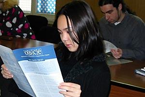 A Kyrgyz student reads an OSCE factsheet at the inauguration ceremony of the new OSCE Academy in Bishkek, December 2002.