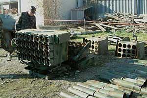 A Serbian soldier inspects a dismantled M-63 rocket launcher under the Dayton Article IV Agreement on Sub-Regional Arms Control, Zagreb, 23 November 2002.