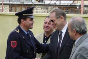 Ambassador Osmo Lipponen, Head of OSCE Presence in Albania (second right) with Bajram Ibraj, General State Police Director, at the opening of the renovated police premises in Berat, 26 November 2002.